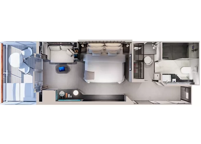 Ocean Suites - Ocean Terrace Suite OT4 Suita 28 m² + kúpeľňa 4 m² + terasa 7 m². 9/10. paluba stred. Spálňa s obývacou časťou, šatník. Minibar, kávovar, vodná kanvica, ďalekohľad, sejf, kúpeľňa so sprchou. Fľaša šampanského na privítanie. Maximálna kapacita 2 dospelé osoby + 1 dieťa do nedovŕšených 18 rokov. 17 600 € 8 800 € za osobu