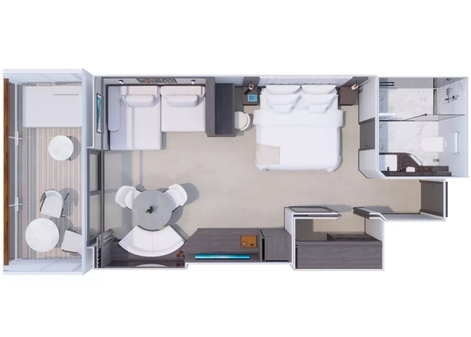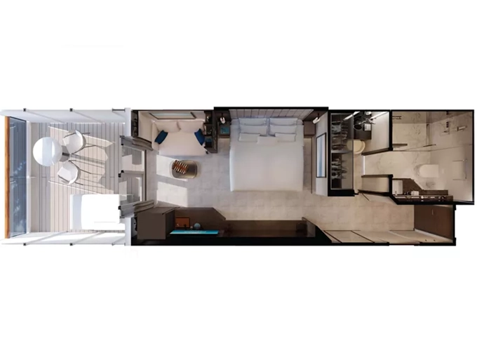 Ocean Residence - Cove Residence Suita + terasa so sedením a lehátkami 56 m². Spálňa s obývacou a jedálenskou časťou, šatník. Koktailová súprava, minibar, kávovar, vodná kanvica, ďalekohľad, sejf, kúpeľňa so sprchou. Závesy, svetlo, klimatizácia ovládané smart technológiou. Taška Technogym Case Kit. Fľaša šampanského na privítanie. Maximálna kapacita 3 osoby. 41 100 € 10 275 € za osobu