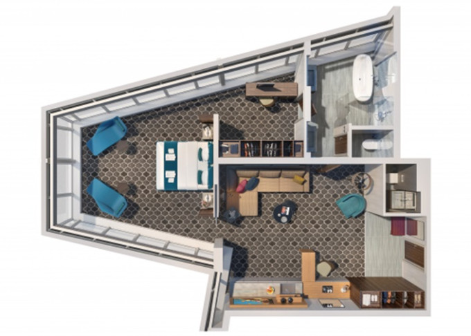 L1 - Crown Loft Suite s balkónom 50 m² + balkón 10 m². 2-podlažný apartmán. 17. paluba. Max 4 osoby. Výhody Royal Suite Sky Class. 9 234 € 9 234 € za osobu