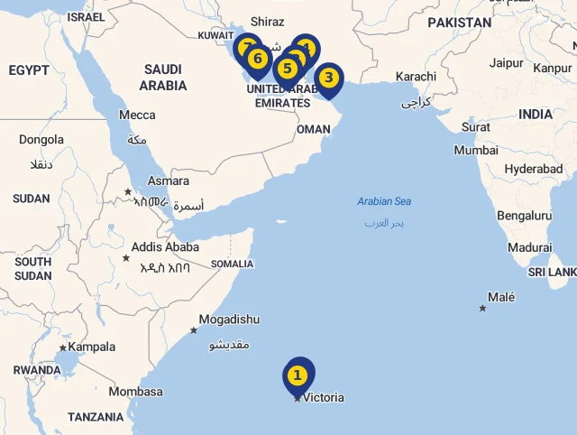 1Port Victoria / Mahe, Seychely02. 04. 2028, príchod o 07:00, odchod o 00:00