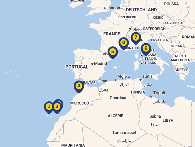 Spoznajte miesta, kde Vaša loď počas plavby zakotví! Každá zastávka je označená číslom, ktoré zodpovedá jej pozícii na mape, aby ste mohli jednoducho sledovať celú trasu. Stačí kliknúť na vybranú destináciu a zistíte viac o každej z nich. Pre ešte lepší prehľad si môžete celý program plavby prezrieť priamo na mape.