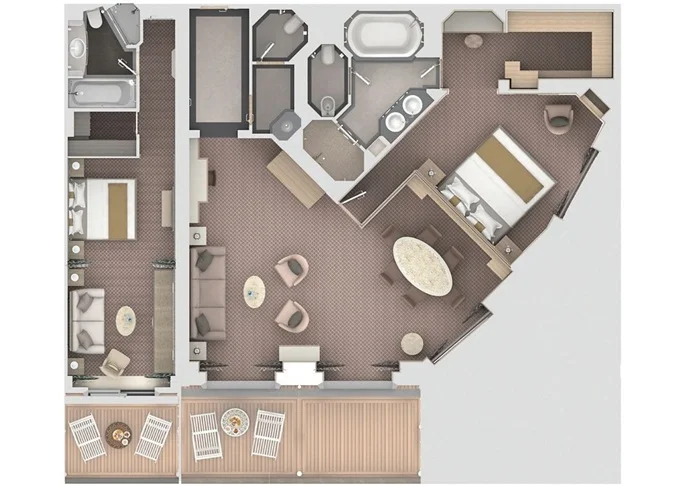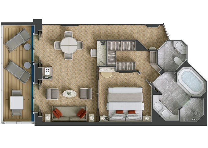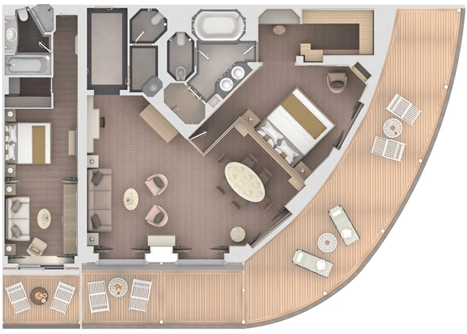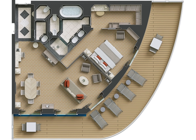 O2 - Owner's Suite 2 119 - 129 m² (vrátane balkóna 12 m²). Owners Suite S1 spojená s Panorama Suite PA 9. paluba - stred. Max 5 osôb. 62 000 € 31 000 € za osobu