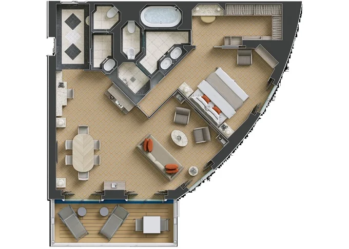 R1 - Royal Suite 1 105 m² (vrátane balkónu). 7. paluba vpredu. Max 3 osoby. 49 200 € 16 400 € za osobu