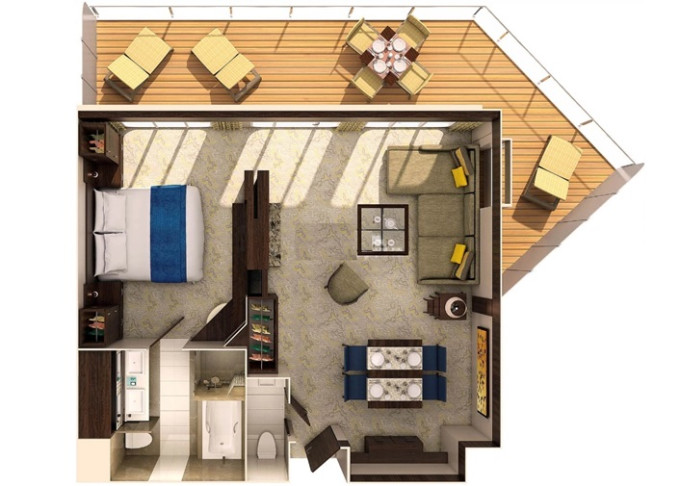 J4 - Junior Suite s balkónom 25 m² + balkón 7,5 m². 6. až 13. paluba. Max 4 osôb. Výhody Royal Suite Sea Class. 6 170 € 6 170 € za osobu