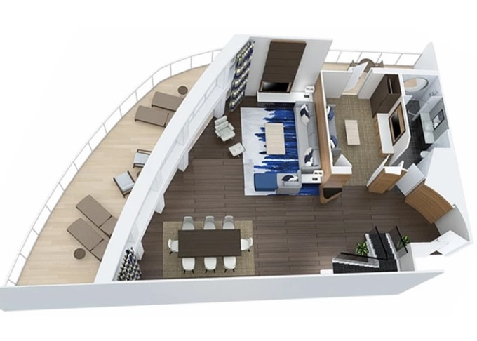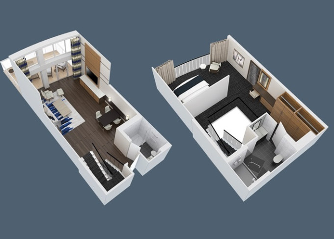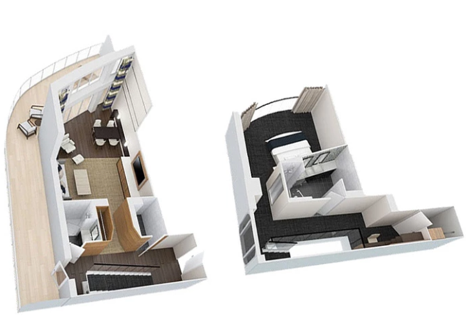 OL - Owner Loft Suite s balkónom 90 m² + balkón 46 m². 2-podlažný apartmán, 2 spálne, 2 kúpeľne. 8. paluba. Max 4 osoby. Výhody Royal Suite Class. 21 736 € 5 434 € za osobu
