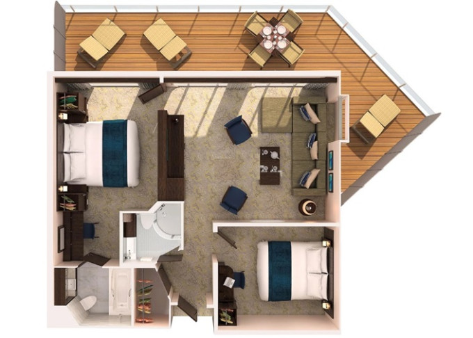 GT - Grand Suite s balkónom / 2 spálne 50 m² + balkón 24 m². 9,10. paluba. 2 spálne, 2 kúpeľne, šatník. Max 8 osôb. Výhody Royal Suite Sky Class. 16 280 € 4 070 € za osobu