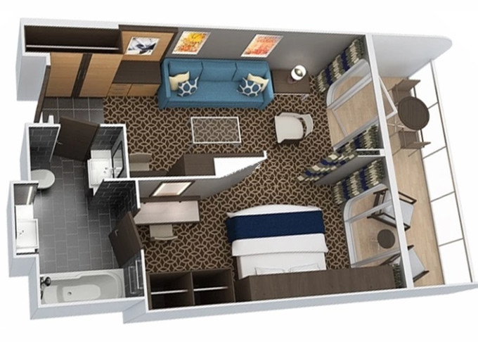 3U - Vnútorná kajuta s virtuálnym balkónom 15 m². Obrazovka veľkosti balkónových dverí s premietaným výhľadom. 7. až 12. paluba. Max 2-4 osoby. 4 028 € 1 007 € za osobu