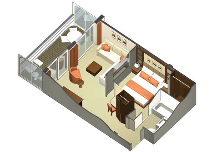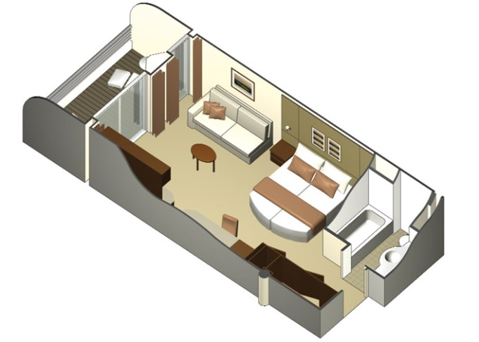 • Kajuty sú umiestnené v blízkosti lodného Spa. K ich vybaveniu patrí posilnený systém vzdušnej filtrácie, posteľ Queen-Size (v kategóriách Edge King-Size), veľké zasúvacie sklenené dvere, exkluzívne posteľné prádlo eXhale®, veľkorysé skladovacie priestory.