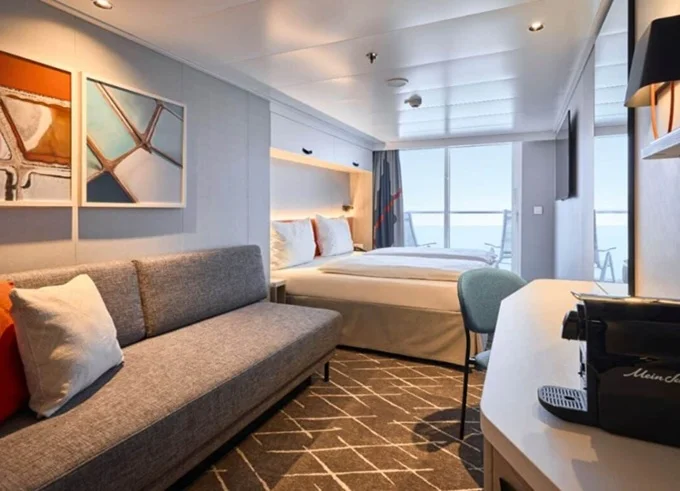 | SUWO - Weitblick Suite 45 m² + balkón 12 m² s hojdacou sieťou. Oddelená spálňa a obývacia časť, šatník. 14. paluba. Max 4 osoby. Výhody Suite. | 8 176 € 2 044 € za osobu |